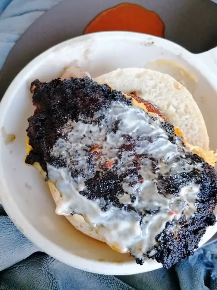 D’habitude, notre poulet frit, on l’aime bien croustillant au Huggy’s. Certains d’entre nous ont tenté de pousser la croustillance à son maximum. Résultat, une cliente s’est retrouvée avec un morceau de charbon dans un pain (preuves à l’appui). On est vraiment super honteux d’avoir osé laisser sortir ça de nos cuisines. On ne s’en excusera sûrement jamais assez ! 🙏