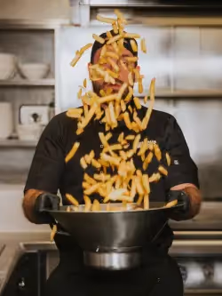 Then, the revelation: Remo. Belgian Bintje potatoes, handled according to the rules of the art. An insane texture, real flavour, perfect crispness. They are delivered raw and cut thick (13 mm, the ideal balance between crisp and soft). They are cooked every day, to perfection, in each restaurant and according to the Belgian tradition, with a double fry, by our awesome chefs.