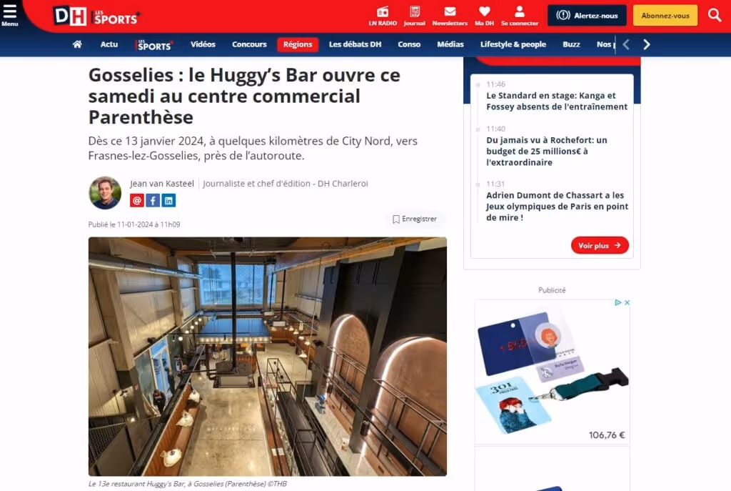 The Liège‑based chain Huggy’s Bar is opening its 13th restaurant in Gosselies, at the Parenthèse shopping centre a few kilometres from City Nord towards Frasnes‑lez‑Gosselies, almost alongside the E42.